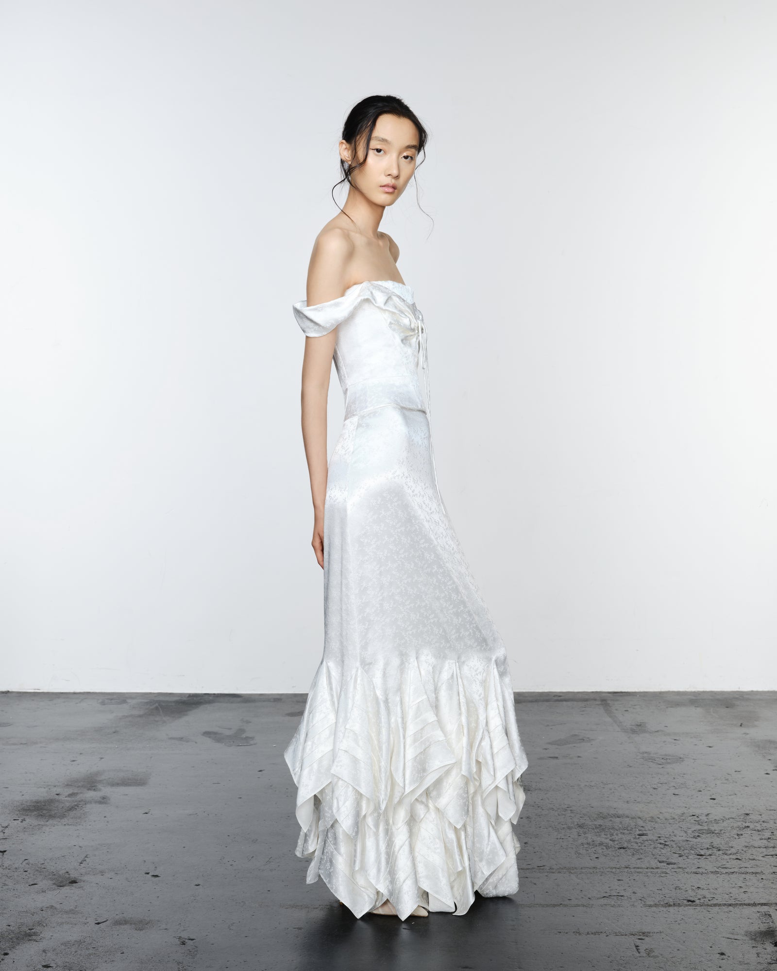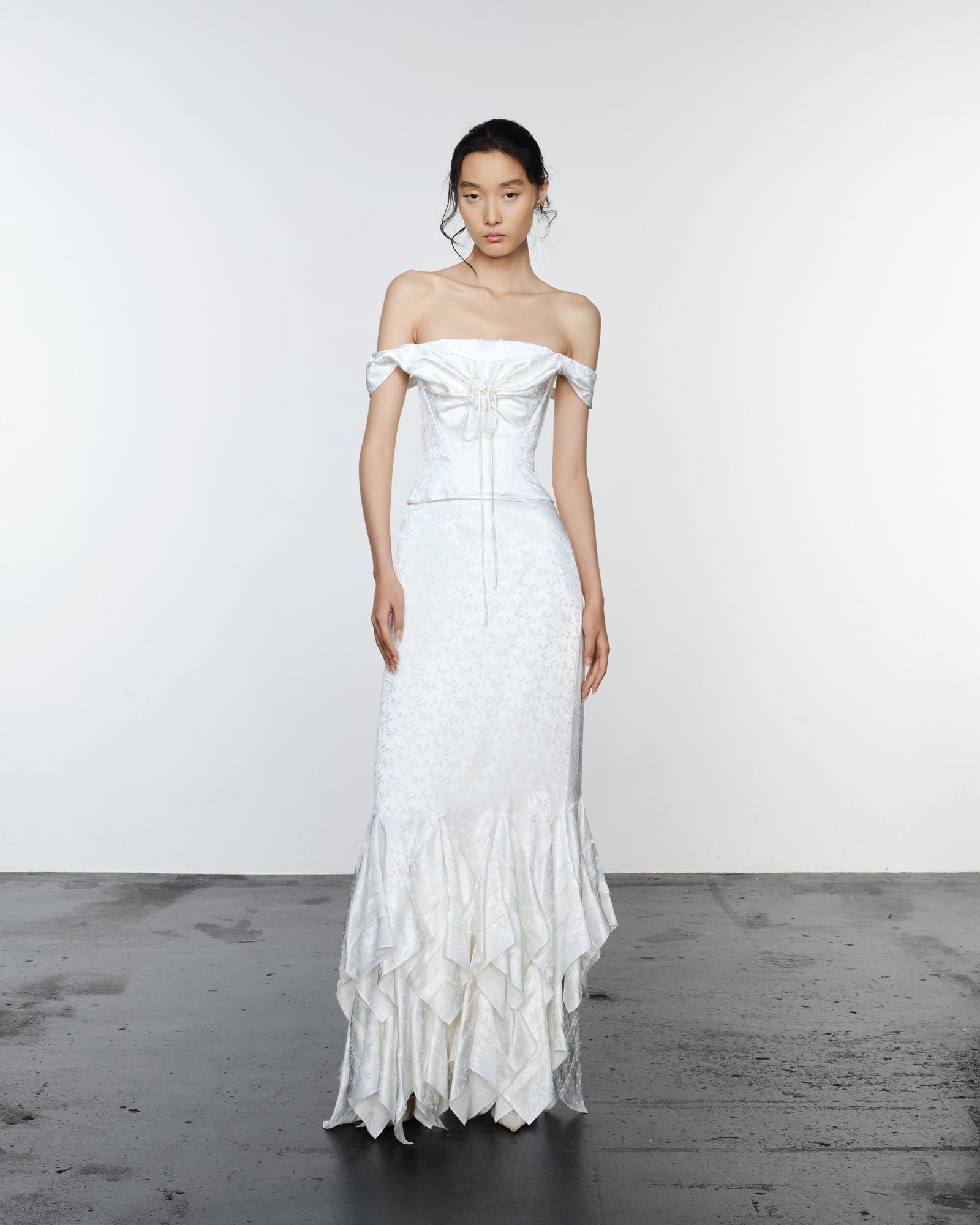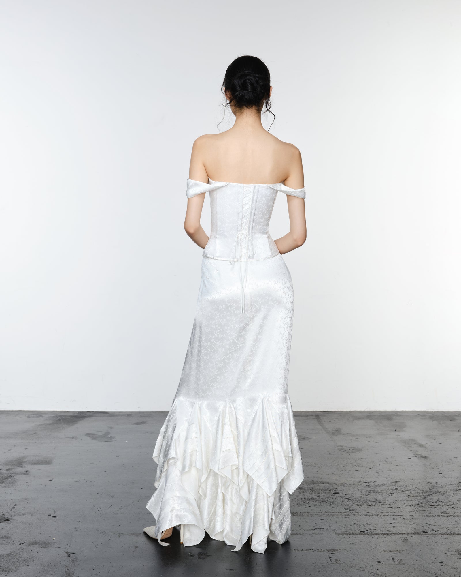 The Alba Skirt is crafted in floral jacquard and reimagines the classic slip skirt with layered pleated godets at the hem, adding texture, volume, and subtle detail. Finished with an invisible zip for a clean closure.