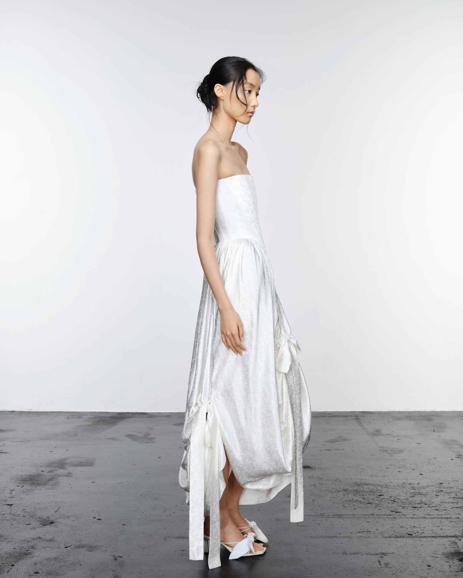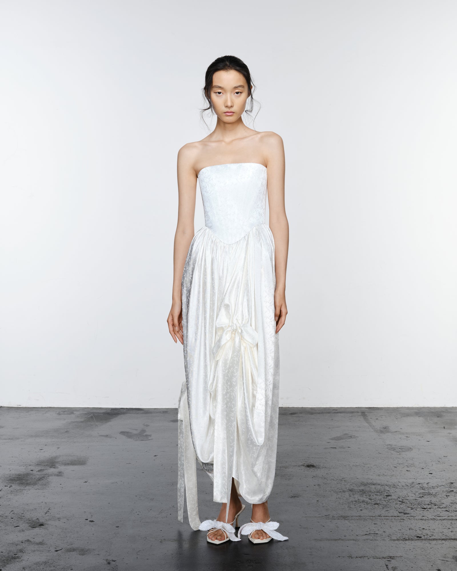 The Serena Jacquard Dress is cut in slink floral jacquard and corsetted bodice.