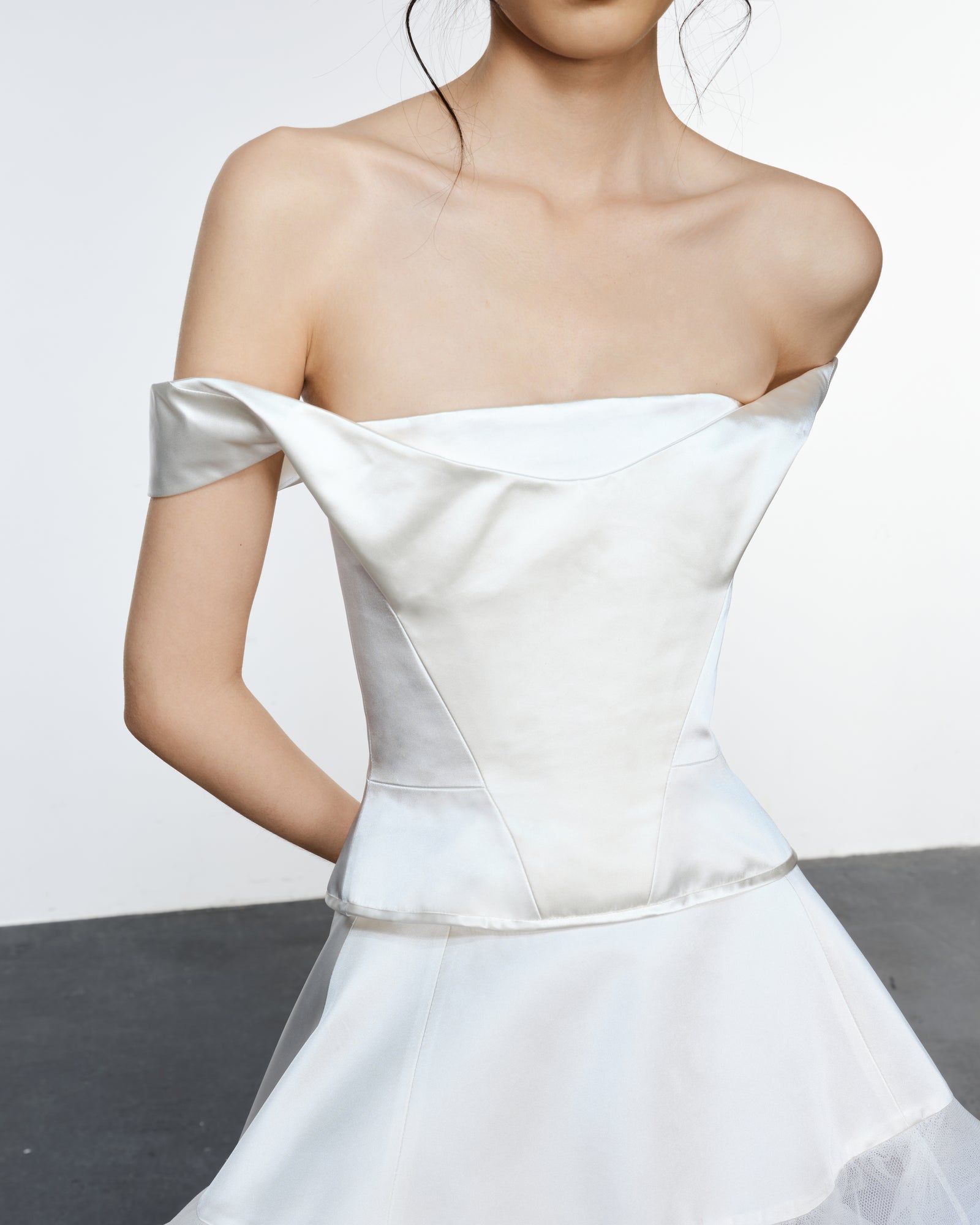 Duchesse satin corset with a dropped waistline and elegant off-shoulder straps.